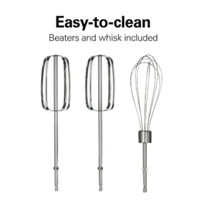 Designed for user convenience, this mixer includes multiple attachments: two traditional beaters, a whisk, and two dough hooks—all dishwasher-safe for easy cleanup. The innovative snap-on storage case keeps everything securely organized and travel-ready. A rubberized grip ensures comfortable handling, even during extended use, and the Bowl Rest feature allows the mixer to stand upright on your mixing bowl, preventing drips and mess during recipe prep.